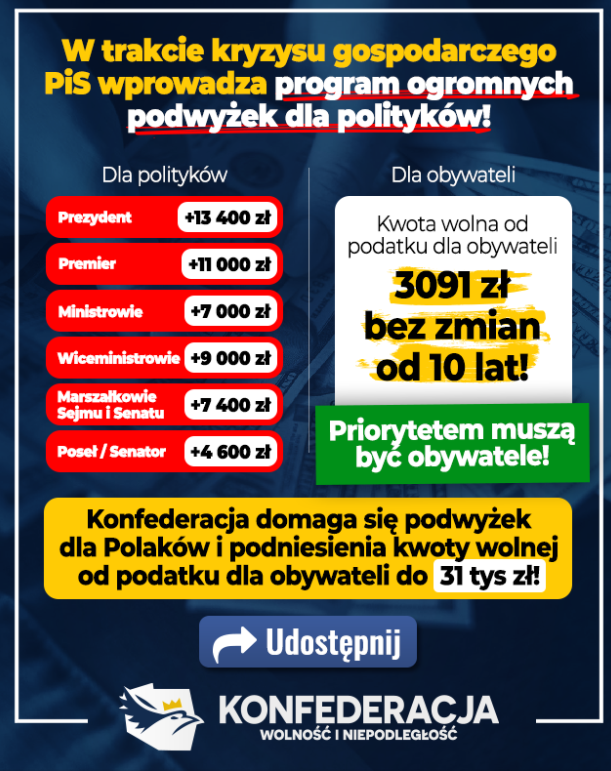 Skoro wszystkie „równiejsze świnie” bez skrupułów wepchają ryje w to kopiaste koryto.to Konfederacja powinna tą podwyżkę przyjąć, ale te brudne pieniądze, a przynajmniej część wykorzystać dla przyszłości Kraju i Polaków. Np. na pohybel dla POPISu! i organizację niezależnego portalu informacyjnego by dotrzeć do jak najszerszego spektrum wyborców omijając monopol państwowej i prywatnych TV.