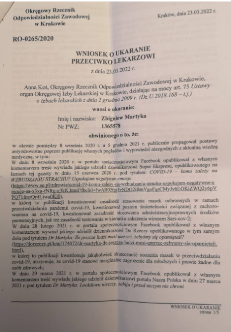 Doktor Martyka udostępnił w Internecie wniosek o ukaranie sporządzony przez Okręgowego Rzecznika Odpowiedzialności Zawodowej. Jest to absolutne kuriozum. Wyliczone w nim „przewinienia” doktora Martyki to właśnie postawa naukowa, medyczna i prozdrowotna. Doktor Martyka miał rację!