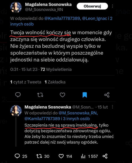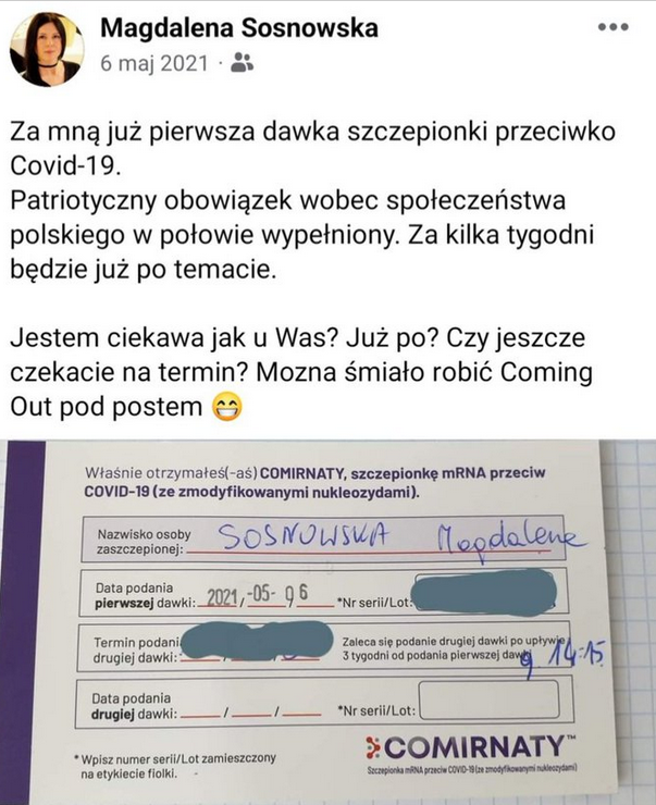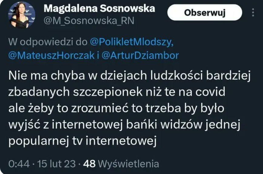 Nie widzę tu dużej kolizji z zasadniczą linią Konfederacji, która nie była przeciw szczepieniom, a ich przymusie, czyli była za prawem wyboru. Zapewne część polityków Konfederacji i ich rodzin się zaszczepiło, i miała do tego pełne prawo. W przypadku tej kandydatki jest tylko żenada i niesmak z dorabiania ideologii (narodowo – patriotycznej) do swojej indywidualnej decyzji. Choroba (głupota) społeczna polegająca na zdobywaniu popularności przez eksponowanie prywatności nie ma, co potwierdza i ten przypadek barw politycznych! Dodam, że ja ani żona i nastoletni synowie nie szczepiliśmy się. Ja przeszedłem C19 jak 3dniowe przeziębienie, a oni mieszkając ze mną (bez izolacji) nie mieli żadnych objawów.