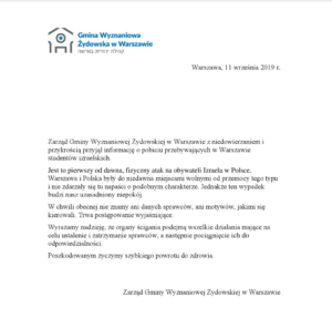 W środę (11.09.2019), a więc tego samego dnia, w którym policja poinformowała o zatrzymaniu podejrzanych Ormian i poszukiwaniach Palestyńczyka, zarząd Gminy Wyznaniowej Żydowskiej w Warszawie wydał oświadczenie, w którym napisano: „W chwili obecnej nie znamy ani danych sprawców, ani motywów, jakimi się kierowali”. Kuriozalne oświadczenie napisano w taki sposób, że dla osoby niezorientowanej, co się stało, brzmi ono, jakby to Polacy napadli na Żydów.