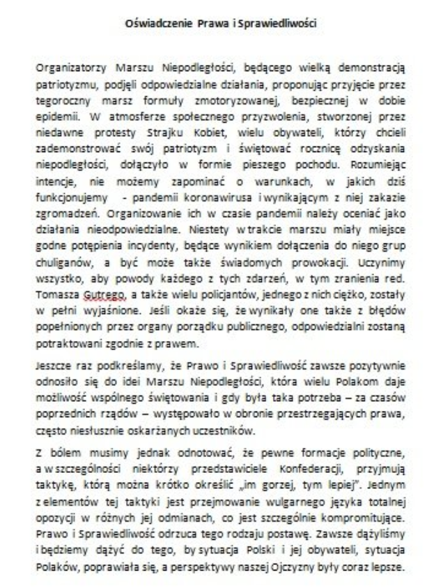 W czwartek wieczorem (12.11.2020) Prawo i Sprawiedliwość wydało oświadczenie w sprawie Marszu Niepodległości, w którym zapewnia, że „zawsze pozytywnie odnosiło się do idei” tego wydarzenia. Jedocześnie zaatakowano Konfederację zarzucając jej przedstawicielom stosowanie taktyki „im gorzej, tym lepiej” oraz „przejmowanie wulgarnego języka totalnej opozycji”. Oświadczenie opublikowała na Twitterze Anita Czerwińska, rzecznik prasowy PiS.