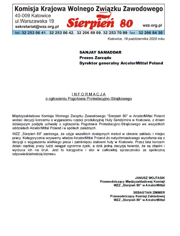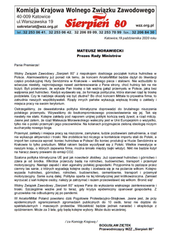 Przewodniczący „Sierpnia 80”, Bogusław Ziętek, wystosował też w imieniu związku list otwarty do premiera Mateusza Morawieckiego, w którym przypomina, że już w 2019 roku hutnicy ostrzegali, iż koncern będzie dążył do likwidacji wielkiego pieca i stalowni. – Nie wzbudziło to wówczas, niestety, nawet najmniejszego zainteresowania z Pana strony (…) Rządy innych państw wykazują większą troskę o zakłady i miejsca pracy na swoim terytorium – pisze Ziętek
