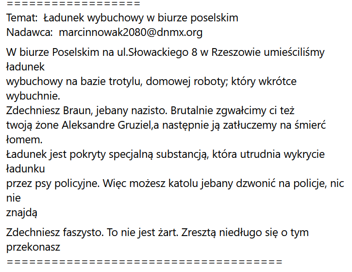 Mail z pogróżkami i informacją o bombie w biurze poselskim Grzegorza Brauna: „Zdechniesz, faszysto. Brutalnie zgwałcimy ci żonę i zatłuczemy łomem”