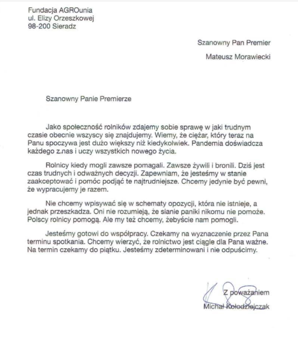 W ramach środowego (21.10.2020) protestu rolników, domagających się wycofania ustawy „Piątka dla zwierząt” i dymisji ministra rolnictwa Grzegorz Pudy, Agrounia blokuje rondo w Koszutach koło Środy Wielkopolskiej. Obecny na proteście Michał Kołodziejczak oświadczył, że rolnicy oczekują na wyznaczenie terminu rozmowy z premierem Mateuszem Morawieckim, ponieważ nie uznają nowego ministra rolnictwa popierającego ustawę „Piątka dla zwierząt”. Agrounia wystosowała też list do premiera z prośbą o spotkanie.