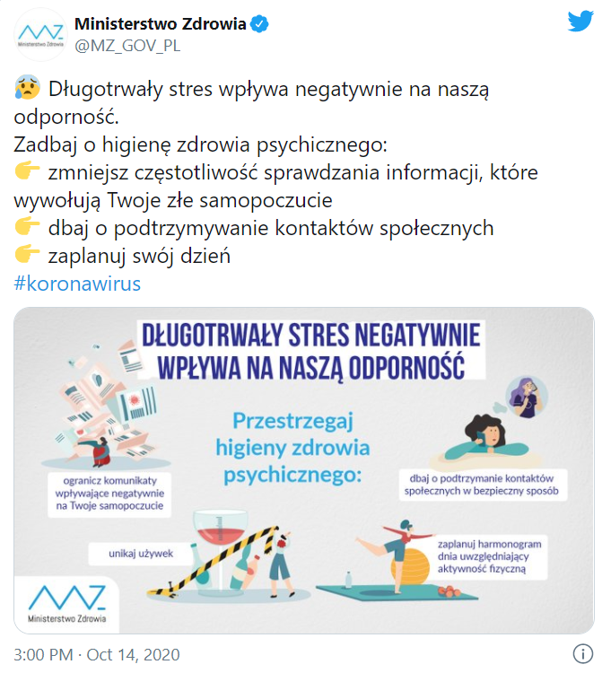W środę (14.10.2020) na twitterowym koncie Ministerstwa Zdrowia pojawiła się grafika z instrukcją, jak unikać stresu, który obniża odporność organizmu. – Zmniejsz częstotliwość sprawdzania informacji, które wywołują Twoje złe samopoczucie – radzi MZ.