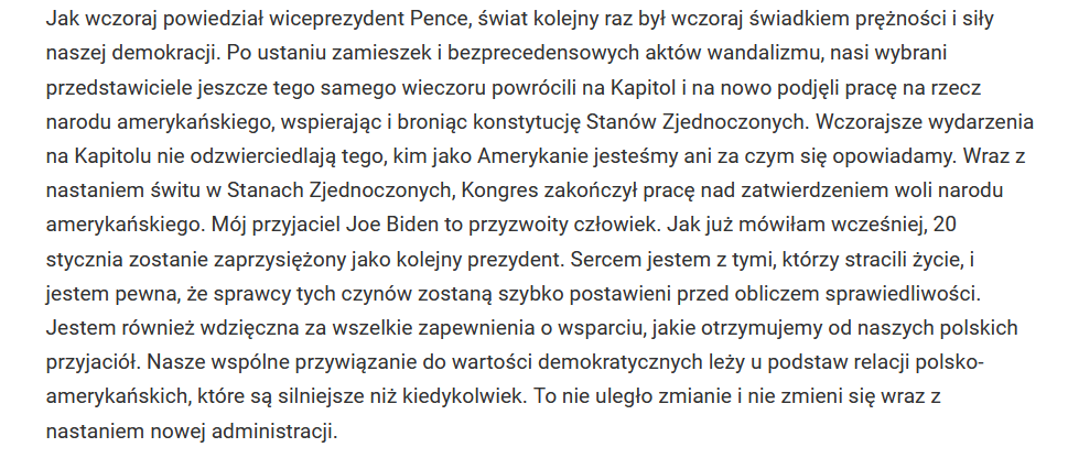 Ambasador Mosbacher, rzekomo wielka przyjaciółka Donalda Trumpa, szybko odnalazła się w nowej sytuacji. – Mój przyjaciel Joe Biden to przyzwoity człowiek – napisała w oświadczeniu. Zapewniła też, że amerykańska demokracja jest „silna i prężna”, a zatwierdzenie wyboru Bidena przez Kongres to „zatwierdzenie woli narodu amerykańskiego”.