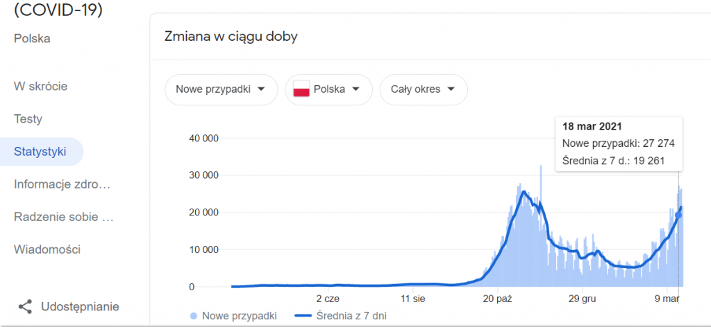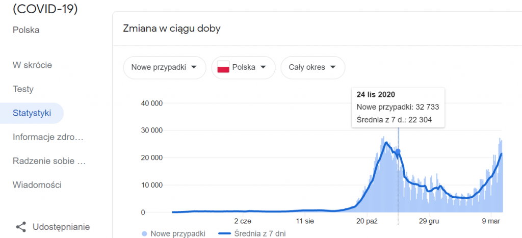 „najwięcej dziennych zakażeń odnotowano 24 listopada 2020 roku. Było to 32 733 przypadków. Obecnie władza straszy „bardziej zaraźliwym” wirusem brytyjskim, który – według Niedzielskiego – odpowiada już za 80% zakażeń. Dotychczasowy rekord tzw. trzeciej fali padł 18 marca 2021 roku i wyniósł 27 274 przypadków. A więc jeszcze nie osiągnęliśmy rekordu sprzed pojawienia się brytyjskiej mutacji!””