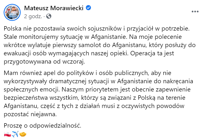 – Stale monitorujemy sytuację w Afganistanie. Na moje polecenie wkrótce wylatuje pierwszy samolot do Afganistanu, który posłuży do ewakuacji osób wymagających naszej opieki. Operacja ta jest przygotowywana od wczoraj – napisał Morawiecki na Facebooku. – Naszym priorytetem jest obecnie zapewnienie bezpieczeństwa wszystkim, którzy są związani z Polską na terenie Afganistanu, część z tych z działań musi z oczywistych powodów pozostać niejawna – dodał.