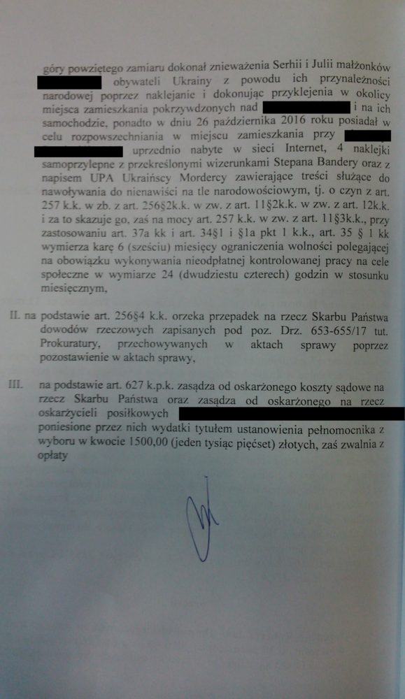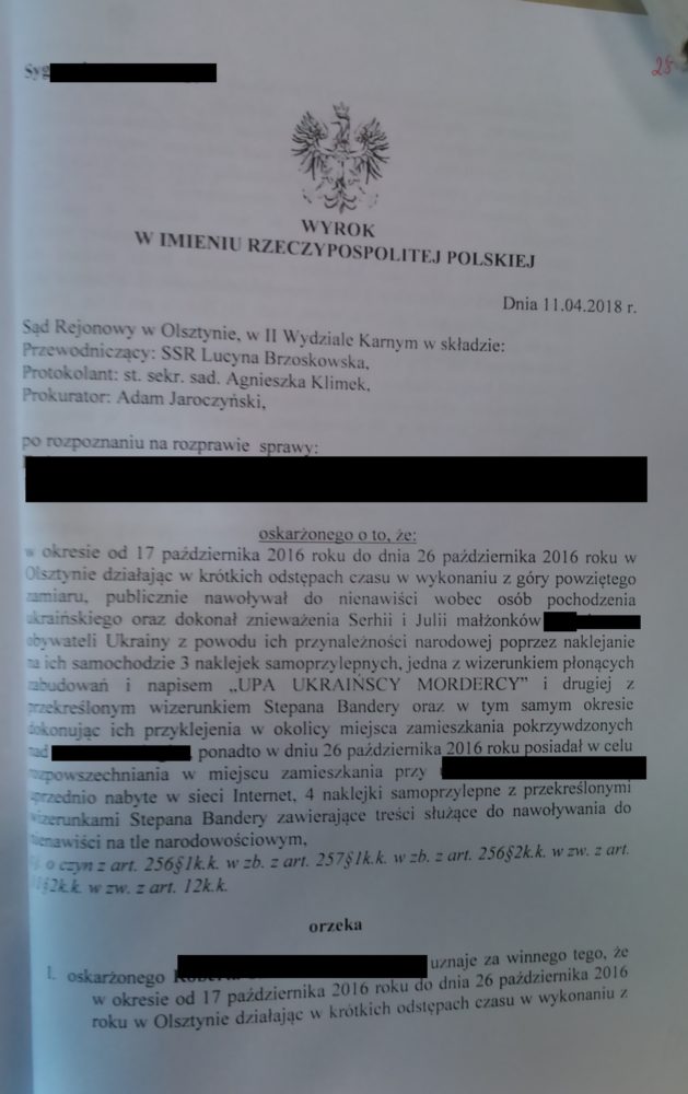 11 kwietnia, Robert z Olsztyna, o którego sprawie informowaliśmy Państwa na naszym portalu, został skazany na pół roku ograniczenia wolności polegającej na obowiązku wykonywania nieodpłatnej kontrolowanej pracy na cele społeczne w wymiarze 24 godzin w stosunku miesięcznym. Sędzia Lucyna Brzoskowska z Sądu Rejonowego w Olsztynie uznała, że pan Robert znieważył ukraińskie małżeństwo Serhię i Julię H., na których samochodzie mężczyzna rozlepił trzy naklejki, zdaniem sądu, zawierające treści służące do nawoływania do nienawiści. Co istotne, mężczyzna nie został skazany za zaśmiecanie środowiska czy nielegalne rozlepianie ulotek w miejscu publicznym czy niszczenie cudzego mienia, ale z art. 257 k.k. w zb. z art. 256 § 2 k.k.