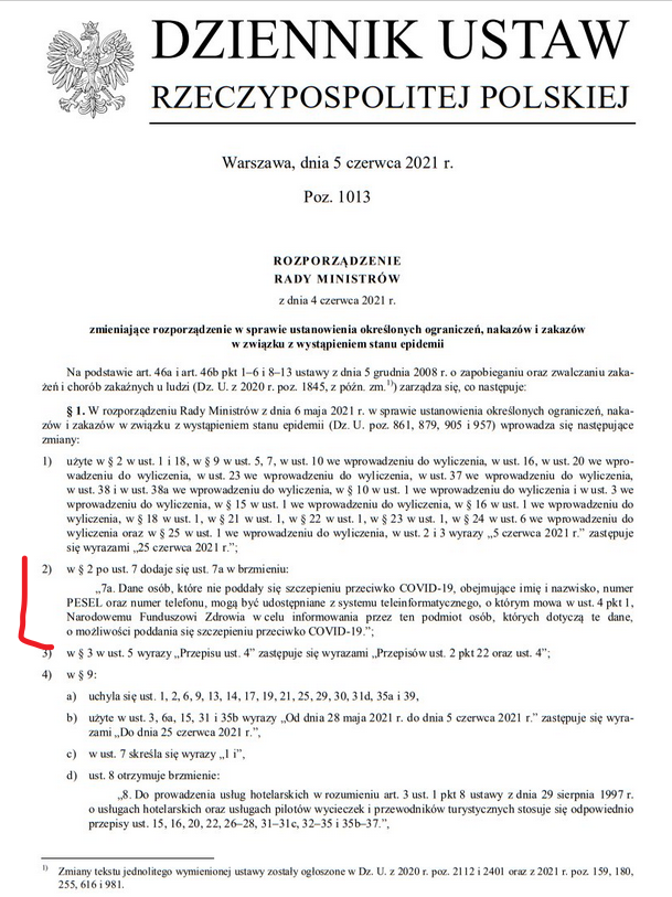 W piątek (4.06.2021) w Dzienniku Ustaw opublikowano rozporządzenie Rady Ministrów, które zezwala na przekazywanie Narodowemu Funduszowi Zdrowia danych osób niezaszczepionych. Dane obejmują imię, nazwisko, PESEL i numer telefonu. Celem ma być „poinformowanie o możliwości zaszczepienia się na Covid-19”. Rozporządzenie wchodzi w życie z dniem 7 czerwca.