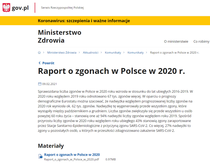 – Spośród przyrostu liczby zgonów w 2020 roku względem roku ubiegłego 43% stanowią zgony zaraportowane przez Stacje Sanitarno-Epidemiologiczne z przyczyną zgonu SARS-CoV-2. Co więcej, 27% nadwyżki to zgony u pozostałych osób, u których w przeszłości zdiagnozowano zakażenie SARS-CoV-2 – czytamy we wstępie do raportu. Na wypadek, gdyby Ministerstwo Zdrowia postanowiło dokonać zmian wycofując się z tych „rewelacji”, zamieszczam screen.