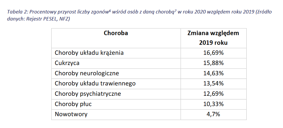 W raporcie znalazła się też tabela pokazująca o ile wzrosła liczba zgonów wśród osób z daną chorobą. Przestano leczyć ludzi, więc zaczęli umierać. Sztuczki z covidową statystyka robi się po to, żeby podważyć tę oczywistą oczywistość.