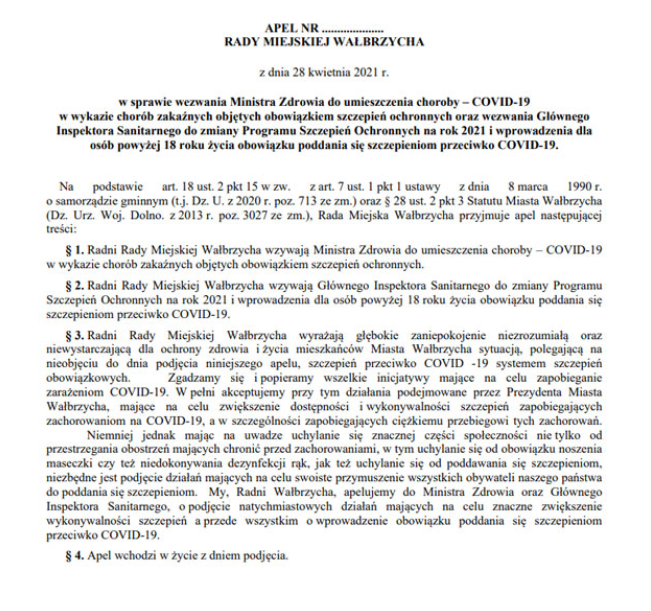 W czwartek (29.04.2021) Rada Miejska w Wałbrzychu przyjęła uchwałę wprowadzającą obowiązkowe szczepienia kowidowe dla wszystkich mieszkańców powyżej 18 roku życia oraz dla osób, które nie mieszkają w Wałbrzychu, ale pracują na terenie miasta. Radni wystosowali też apel do Ministerstwa Zdrowia, aby szczepionkę na kowid wpisać na listę szczepień obowiązkowych.