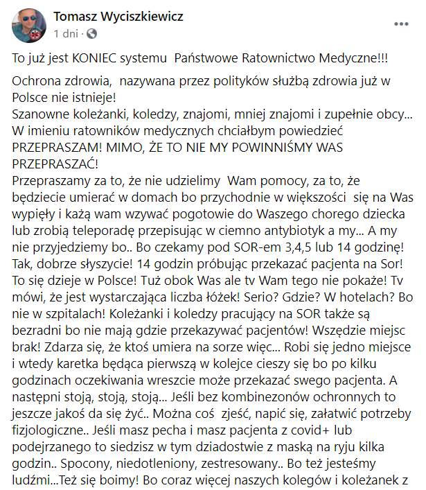 – Przepraszamy za to, że nie udzielimy Wam pomocy, za to, że będziecie umierać w domach bo przychodnie w większości się na Was wypięły i każą wam wzywać pogotowie do Waszego chorego dziecka lub zrobią teleporadę przepisując w ciemno antybiotyk a my… A my nie przyjedziemy bo.. Bo czekamy pod SOR-em 3,4,5 lub 14 godzinę! Tak, dobrze słyszycie! 14 godzin próbując przekazać pacjenta na SOR! – pisze Wyciszkiewicz.