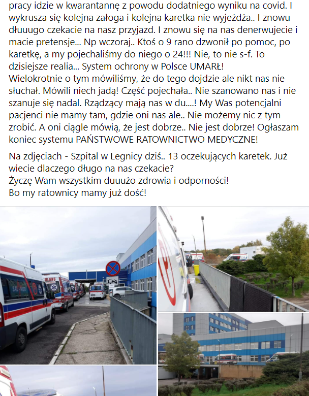 We wtorek (27.10.2020) ratownik medyczny z Lubina, Tomasz Wyciszkiewicz, zamieścił na Facebooku dramatyczny wpis dotyczący obecnej sytuacji służby zdrowia w Polsce. – To już jest koniec systemu Państwowe Ratownictwo Medyczne!!! Ochrona zdrowia, nazywana przez polityków służbą zdrowia już w Polsce nie istnieje! – alarmuje Wyciszkiewicz.