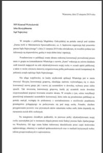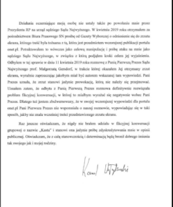 W oświadczeniu odnosi się również do wypowiedzi prezes Gersdorf dla Onetu na temat hejtu wobec niej. „Jestem tym przerażona, bo oczywiście te hejty w stosunku do mnie były bardzo częste, ale nie przypuszczałam, że to jest jakaś zmasowana akcja, a nie indywidualne wypowiedzi” – powiedziała prezes SN. „Jestem zbulwersowany, że w swojej wczorajszej wypowiedzi dla portalu onet.pl Pani Pierwsza Prezes nie wspomniała o naszej rozmowie, wypowiadając się w taki sposób, jakby nie znała wcześniej treści przedstawionego zrzutu ekranu” – napisał w oświadczeniu sędzia Wytrykowski.