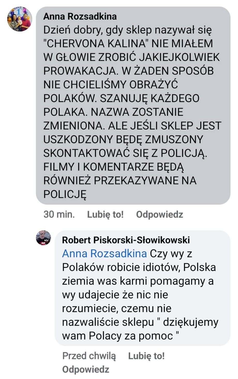 Komentarz do sprawy opublikował właściciel sklepu (z konta na Facebook’u – Anna Rozsadkina). Właściciel zapewnił, że „nazwa zostanie zmieniona” i zagroził zawiadomieniem organów ścigania. Na chwilę obecną (9.01.2023 r.) właściciel słowa nie dotrzymuje, bo zaledwie kilka godzin po zdjęciu, szyld wrócił na witrynę sklepową.