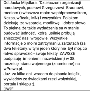 – Dziękuję Wam Polacy. Zdrajcy zdjęli maski, a to co wydarzyło się w 38. rocznicę wprowadzenia stanu wojennego wbrew pozorom ogromnie mnie umocniło! Kompletuję sprzęt do pracy i wracam do publicystycznej walki o prawdę! CWP – napisał Jacek Międlar na Twitterze załączając podziękowania dla osób, które wsparły go po zatrzymaniu przez ABW.