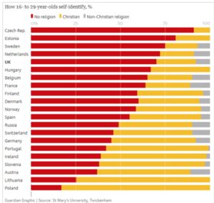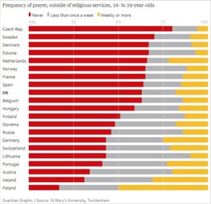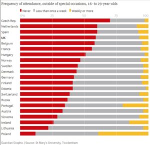 Kościół (instytucja/organizacja) po (przewidywanym przez mnie) upadku – warto odbudować jako strukturę tworzoną przez wiernych. Ich Wiara będzie siłą nośną nowej konstrukcji! Dlatego badania, na które natrafiłem, ucieszyły mnie! (zobacz wykresy dotyczące religijne zaangażowania 16 – 29-latków, ich uczęszczania do kościoła oraz modlenia się). Polska młodzież dodatnio się wyróżnia na tle innych krajów! A większość jej ciągle żyje w ubóstwie, biedzie lub nędzy. Uświadommy sobie: skoro nasze PKB zbliża się wielkością do niemieckiego, a płace ciągle są na poziomie ¼ zarobków nad Renem – jak żydowska finansjera (korzystając z polityczno-ekonomicznych mechanizmów globalizacji) bezwzględnie łupi kraj położony nad Wisłą! Za pełnym przyzwoleniem – rządzących tym USraelsko-Unijnym protektoratem!