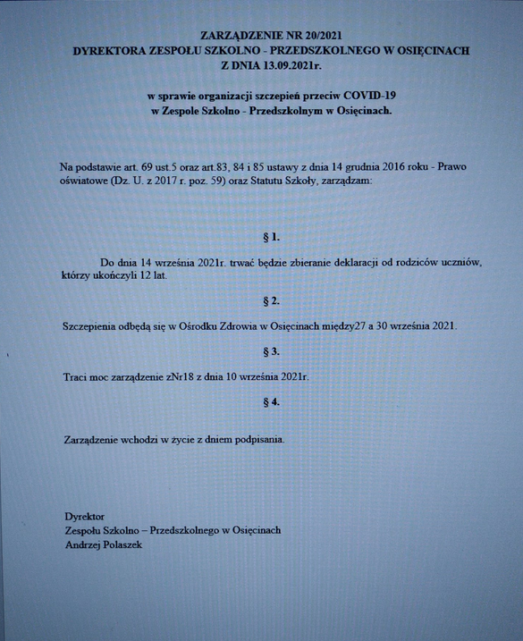 W piątek (10.09.2021) dyrektor szkoły podstawowej w Osięcinach (woj. kujawsko-pomorskie), Andrzej Polaszek, wydał rozporządzenie w sprawie organizacji szczepień dla uczniów. W rozporządzeniu znalazł się zapis dyskryminujący niezaszczepionych. Dyrektor zarządził, że zaszczepieni uczniowie dostaną dodatkowe 20 punktów ze sprawowania i zostanie dla nich urządzona dyskoteka, na którą nie będą wpuszczani niezaszczepieni.