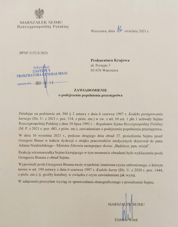 W piątek (17.09.2021) Prokuratura Okręgowa w Warszawie poinformowała o wszczęciu dochodzenia w sprawie wypowiedzi posła Grzegorza Brauna skierowanej do ministra zdrowia Adama Niedzielskiego: „Będziesz Pan wisiał”. Zawiadomienie złożyła marszałek Sejmu Elżbieta Witek.