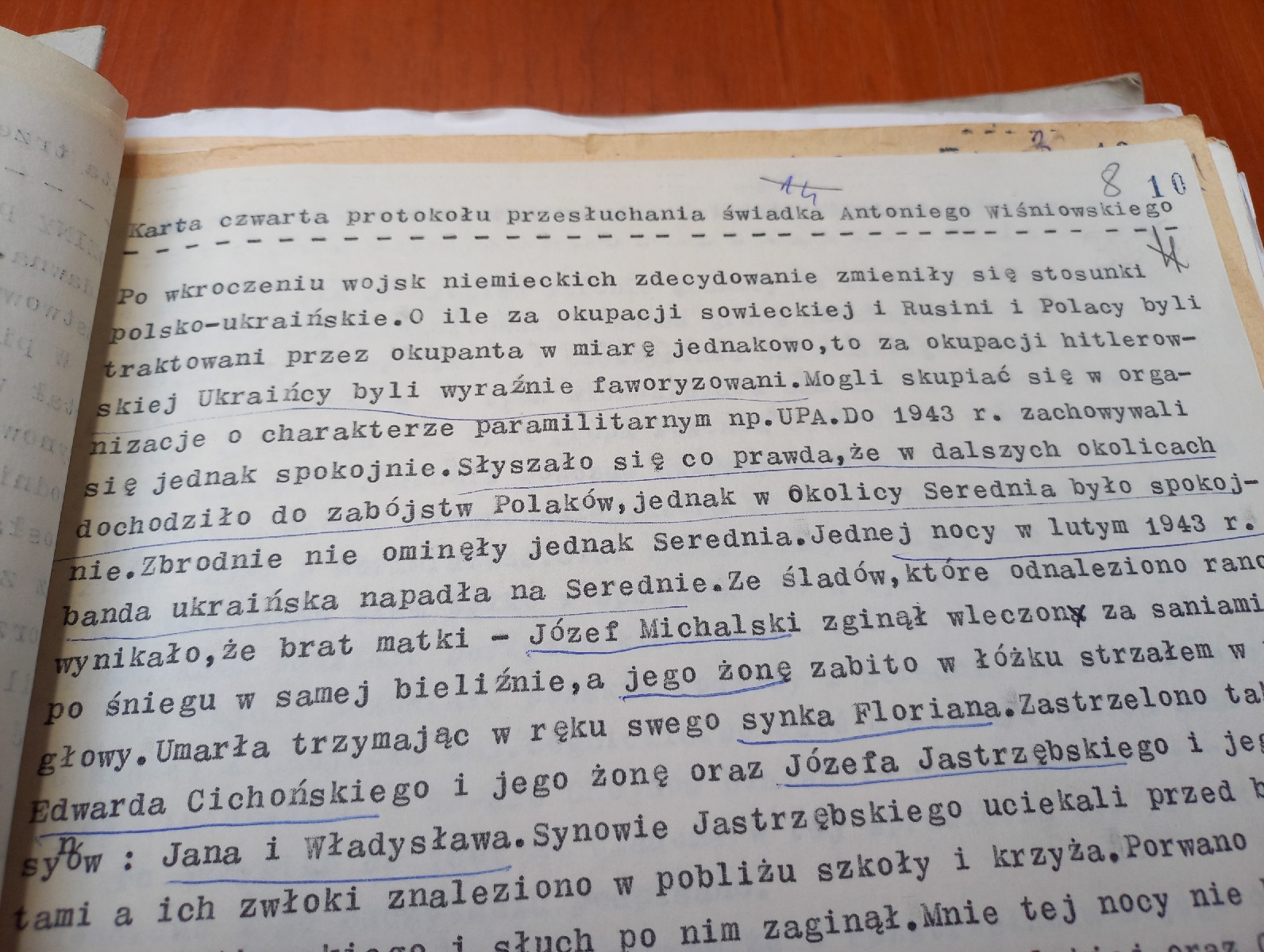 – Po wkroczeniu wojsk niemieckich zdecydowanie zmieniły się stosunki polsko-ukraińskie. O ile za okupacji sowieckiej i Rusini, i Polacy byli traktowani przez okupanta w miarę jednakowo, to za okupacji hitlerowskiej Ukraińcy byli wyraźnie faworyzowani. Mogli skupiać się w organizacje o charakterze paramilitarnym np. UPA. Do 1943 r. zachowywali się jednak spokojnie. Słyszało się co prawda, że w dalszych okolicach dochodziło do zabójstw Polaków, jednak w okolicy Serednia było spokojnie. Zbrodnie nie ominęły jednak Serednia. Jednej nocy w lutym 1943 r. banda ukraińska napadła na Serednie. Ze śladów, które odnaleziono rano wynikało, że brat matki – Józef Michalski zginął wleczony za saniami po śniegu w samej bieliźnie, a jego żonę zabito w łóżku strzałem w tył głowy. Umarła trzymając w ręku swego synka Floriana… – zeznaje. Na ów proceder wskazuje także wielu innych Świadków, z którymi przeprowadziłem wywiady. Te rozmowy oraz kilkaset zeznań publikuję w formie nagrać oraz zamieszczę w swojej kolejnej książce.