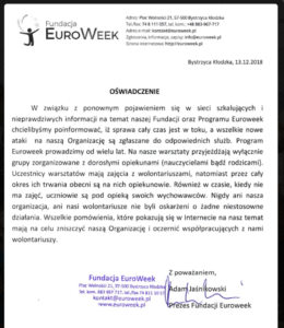 Na stronie euroweek.pl pojawiło się oświadczenie, w którym stwierdzono, że zamieszczane w Internecie informacje na temat działań fundacji są „szkalujące i nieprawdziwe”. „Wszelkie nowe ataki na nasza Organizację są zgłaszane do odpowiednich służby” – czytamy w oświadczeniu.