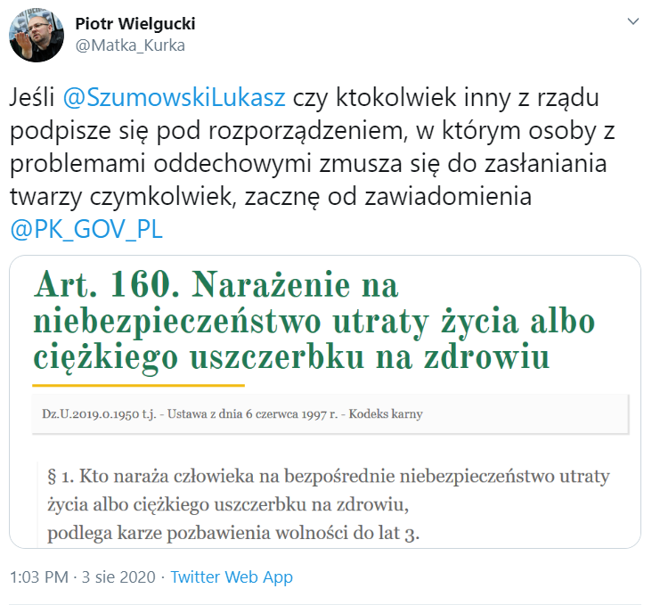 – Jeśli Łukasz Szumowski, czy ktokolwiek inny z rządu podpisze się pod rozporządzeniem, w którym osoby z problemami oddechowymi zmusza się do zasłaniania twarzy czymkolwiek, zacznę od zawiadomienia prokuratury – zapowiedział na Twitterze Piotr Wielgucki (Matka Kurka)