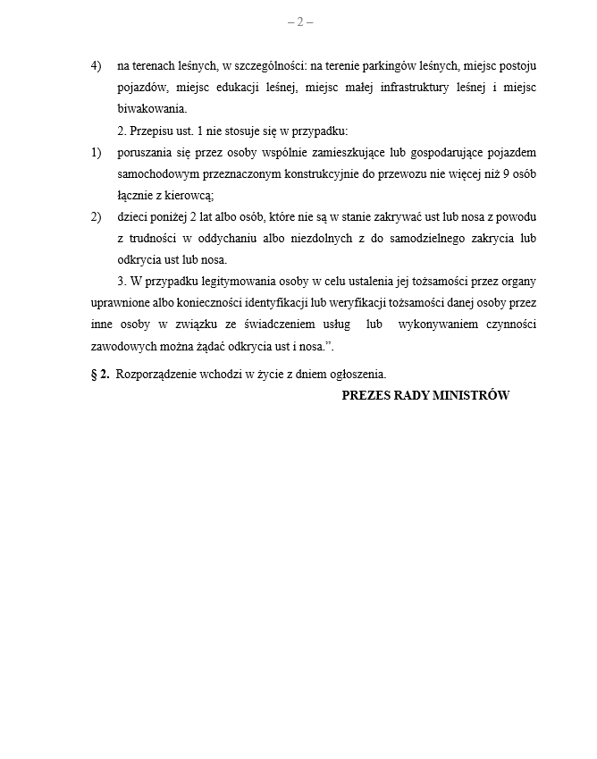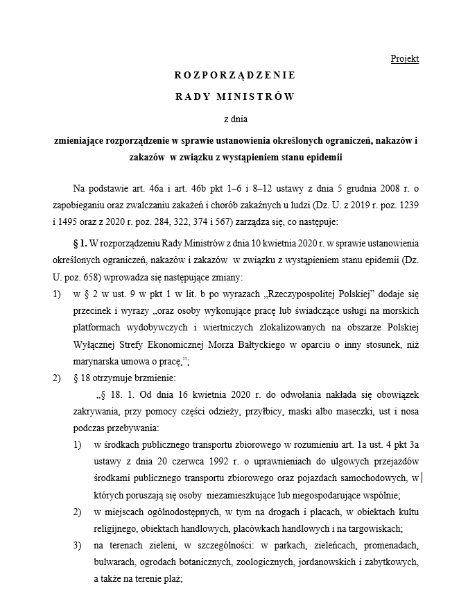Od czwartku (16.04.2020) obowiązuje w Polsce nakaz zakrywania nosa i ust przy pomocy części odzieży, przyłbicy, maski albo maseczki. We wtorek (14.04.2020) został opublikowany projekt rozporządzenia Rady Ministrów wprowadzający szczegółowe przepisy w tej sprawie. Początkowo nakaz dotyczył wszystkich miejsc poza adresem zamieszkania lub stałego pobytu. Według opublikowanego dziś projektu rozporządzenia nakaz zakrywana nosa i ust ma obowiązywać:
