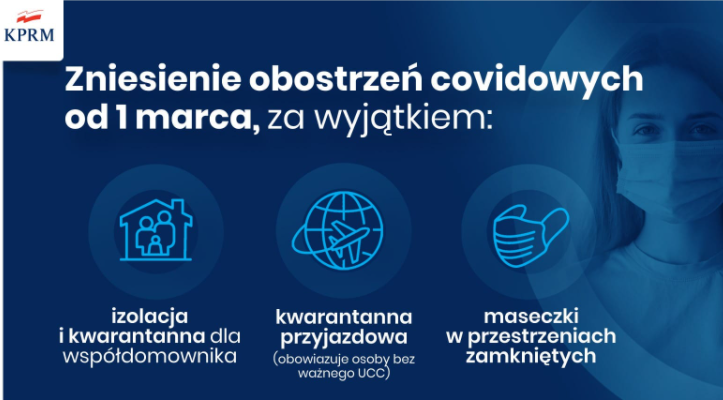 W środę (23.02.2022) premier Mateusz Morawiecki i minister Adam Niedzielski ogłosili, że od 1 marca rząd znosi większość obostrzeń i zostawia tylko te najbardziej konieczne. Jako konieczne wskazali: maski w pomieszczeniach zamkniętych, izolację dla osób z pozytywnym wynikiem, kwarantannę dla współdomowników i kwarantannę dla niezaszczepionych po przyjeździe do kraju.