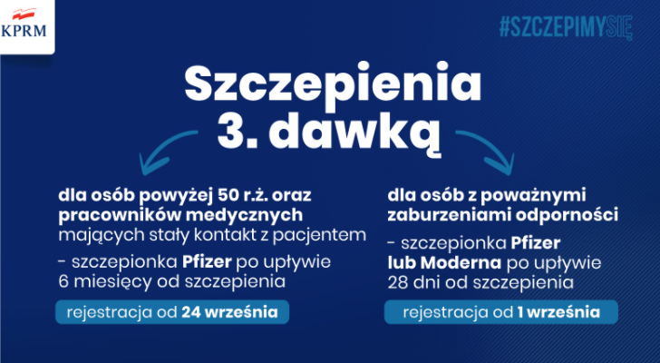 We wtorek (21.09.2021) premier Mateusz Morawiecki i wiceminister zdrowia Waldemar Kraska poinformowali na konferencji prasowej w KPRM, że rząd zdecydował o rozpoczęciu podawania trzeciej dawki szczepionki przeciw Covid-19 pracownikom służby zdrowia oraz wszystkim osobom powyżej 50 roku życia. Trzecia dawka ma być podawana pół roku po drugiej. Dla osób o obniżonej odporności zaleca się podawanie trzeciej dawki 28 dni po drugiej.