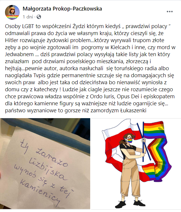 To nie pierwszy raz, gdy Małgorzata Prokop stosuje ohydną, antypolską retorykę. Oto wpis, który zamieściła na Facebooku w poniedziałek (pisownia oryginalna): Osoby LGBT to współcześni Żydzi którym kiedyś „ prawdziwi polacy ” odmawiali prawa do życia we własnym kraju, którzy cieszyli się, że Hitler rozwiązuje żydowski problem…którzy wyrywali trupom złote zęby a po wojnie zgotowali im pogromy w Kielcach i inne, czy mord w Jedwabnem … dziś prawdziwi polacy wysyłają takie listy jak ten który znalazłam pod drzwiami poselskiego mieszkania, złorzeczą i hejtują…pewnie autor, autorka nasłuchali się toruńskiego radia albo naoglądała Tvpis gdzie permanentnie szczuje się na domagajacych się swoich praw albo jest taka od dzieciństwa bo nienawiść wyniosła z domu czy z katechezy ! Ludzie jak ciagle jeszcze nie rozumiecie czego chce prawicowa władza wspólnie z Ordo Iuris, Opus Dei i episkopatem dla którego kamienne figury są ważniejsze niż ludzie ogarnijcie się… państwo wyznaniowe to gorsze niż zamordyzm Łukaszenki.