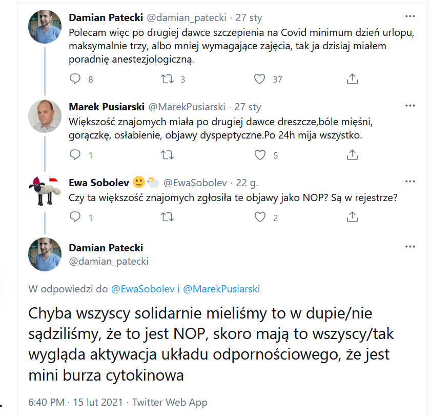 Jeśli lekarze w ten sposób podchodzą do zagadnienia, to nie oczekujmy rzetelnych informacji na temat NOP po szczepieniu na Covid-19. Co ważne, z wpisu wynika, że Patecki jest ozdrowieńcem, a zatem otrzymał dwie dawki szczepionki chociaż jest już odporny. Informacja o tym, jak na szczepienie reaguje taka osoba, jest chyba ważna, prawda?