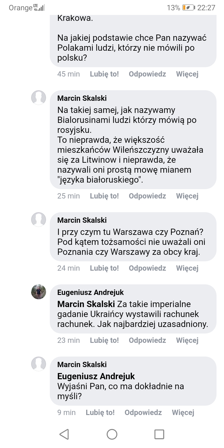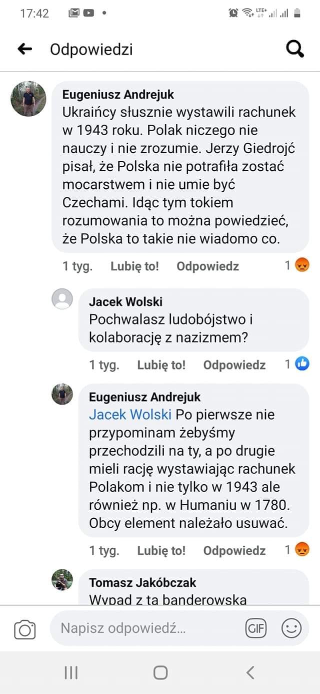 Eugeniusz Andrejuk pochodzi z okolic Bielska Podlaskiego. Jest przedstawicielem mniejszości białoruskiej, a zarazem pracownikiem Polskiego Związku Piłki Siatkowej (PZPS). W sieci opublikował wpis o następującej treści (na dole zamieszczamy zrzuty ekranu): Ukraińcy słusznie wystawili rachunek w 1943 roku. Polak niczego [się- red.] nie nauczy i nie zrozumie. Jerzy Giedrojć pisał, że Polska nie potrafiła zostać mocarstwem i nie umie być Czechami. Idąc tym tokiem rozumowania to można powiedzieć, że Polska to takie nie wiadomo co. Dalej napisał, że Ukraińcy „mieli rację wystawiając rachunek Polakom i nie tylko w 1943 ale również np. w Humaniu w 1780 [domyślamy się, że chodziło o rok 1768, kiedy to miało miejsce powstanie hajdamaków, a które było wymierzone przeciwko polskiemu ziemiaństwu, Żydom i księżom katolickim – przyp. red.], gdyż obcy element należało usuwać. Nadmienił także: Za takie imperialne gadanie Ukraińcy wystawili rachunek. Jak najbardziej uzasadniony.