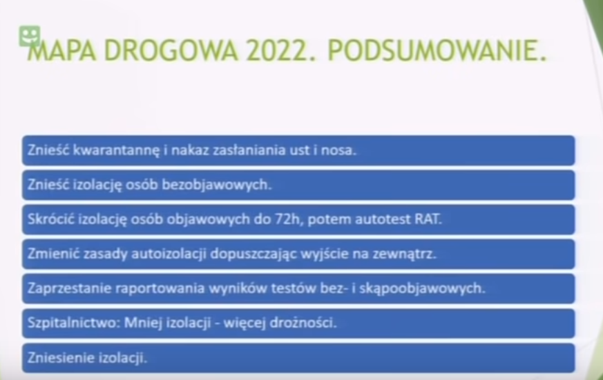 Mapa drogowa zaproponowana przez Basiukiewicza wygląda tak: zniesienie kwarantanny po kontakcie; usunięcie wymogu zasłaniania ust i nosa w przestrzeniach zamkniętych; zniesienie izolacji dla osób bezobjawowych; skrócenie izolacji dla osób objawowych do trzech dni po pozytywnym wyniku testu; zmiana zasad izolacji; dopuszczenie możliwości wyjścia na spacer; zaprzestanie raportowania testów pozytywnych u osób bezobjawowych i skąpoobjawowych; zakończenie programu śledzenia kontaktów; w szpitalach zmniejszenie nacisku na ograniczenie transmisji w celu udrożnienia systemu; całkowite zniesienie izolacji.