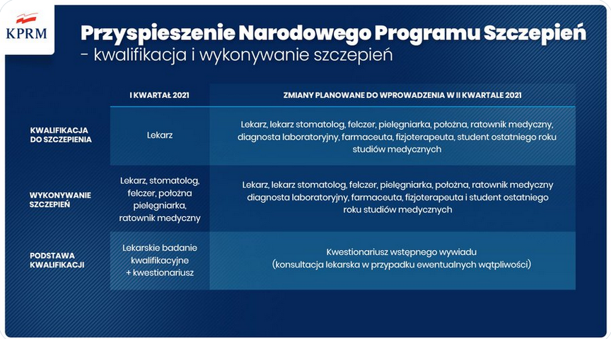 We wtorek (30.03.2021) odbyła się konferencja prasowa premiera Mateusza Morawieckiego, ministra zdrowia Adama Niedzielskiego oraz ministra Michała Dworczyka w punkcie szczepień na Stadionie PGE Narodowym, podczas której poinformowano o zmianie w przepisach dotyczących uprawnień dla osób kwalifikujących i wykonujących szczepienia.
