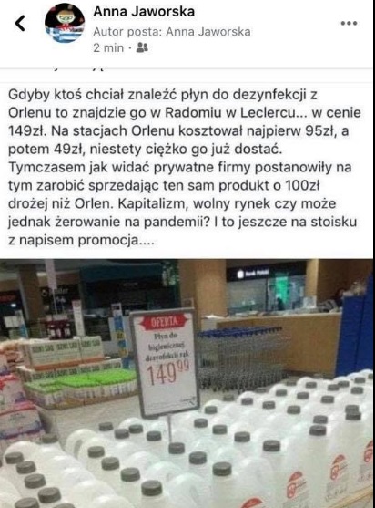 Francuska sieć hipermarketów E. Leclerc wykupiła płyny do dezynfekcji produkowane przez Orlen i sprzedawaje je trzy razy drożej. Za płyn, który po apelach obywateli na stacji Orlen można kupić za jedyne 49 zł, zagraniczny hipermarket sprzedaje za 149,99 zł. W innym markecie ten sam płyn jest dostępny za 139 złotych. Internauci nie kryją oburzenia: „skur**syństwo”, „przez takich Januszy nie mogę kupić! Nie mam wyboru, muszę przepłacić!”.