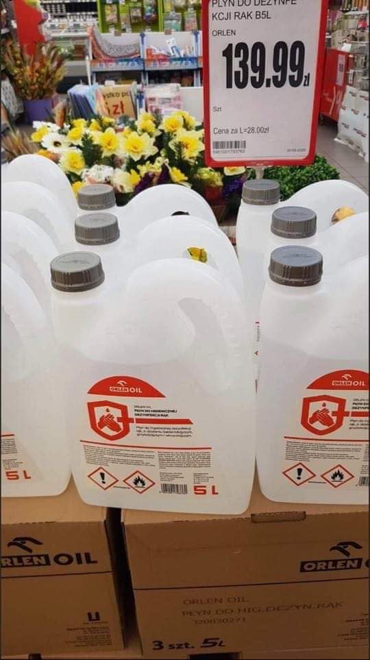 W obliczu epidemii koronawirusa w Polsce PKN Orlen rozpoczął produkcję płynu do dezynfekcji rąk w zakładzie swej spółki zależnej Orlen Oil w Jedliczu. Pięciolitrowa butla z płynem do dezynfekcji – wyprodukowanym przez PKN Orlen – kosztuje 95 zł. To najtańsza cena na rynku, co potwierdzają eksperci. Choć produkty konkurencji są znacznie droższe i kosztują – w przeliczeniu na 5 litrów – od 200 do 500 zł. Okazuje się jednak, że na epidemii postanowiły zarobić francuskie sieci handlowe – jak dowiedział się portal niezalezna.pl chodzi o Intermarche i E.Leclerc, wystawiając zakupiony w Orlenie płyn do dezynfekcji z sutą marżą. Mimo zastrzeżenia, że sprzedany im płyn może być używany tylko do zabezpieczenia pracowników i klientów.
