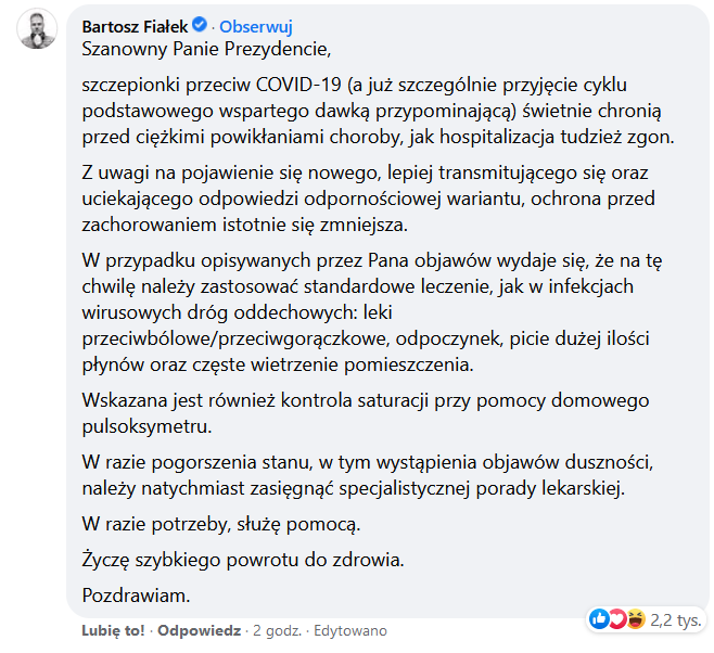 Na wpis byłego prezydenta zareagował reumatolog Bartosz Fiałek, który w charakterze eksperta od szczepień kowidowych był zapraszany do „Polsatu”. Fiałek zapewnił Wałęsę, że trzy dawki szczepionki świetnie chronią przed ciężkimi powikłaniami choroby i poradził mu, żeby brał leki przeciwgorączkowe, odpoczywał, dużo pił i wietrzył pomieszczenia oraz kontrolował saturację przy pomocy pulsoksymetru.