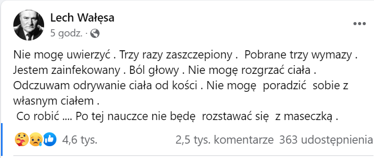 Trzykrotnie zaszczepiony Wałęsa ciężko przechodzi Covid. Reumatolog Fiałek leczy go przez Facebooka