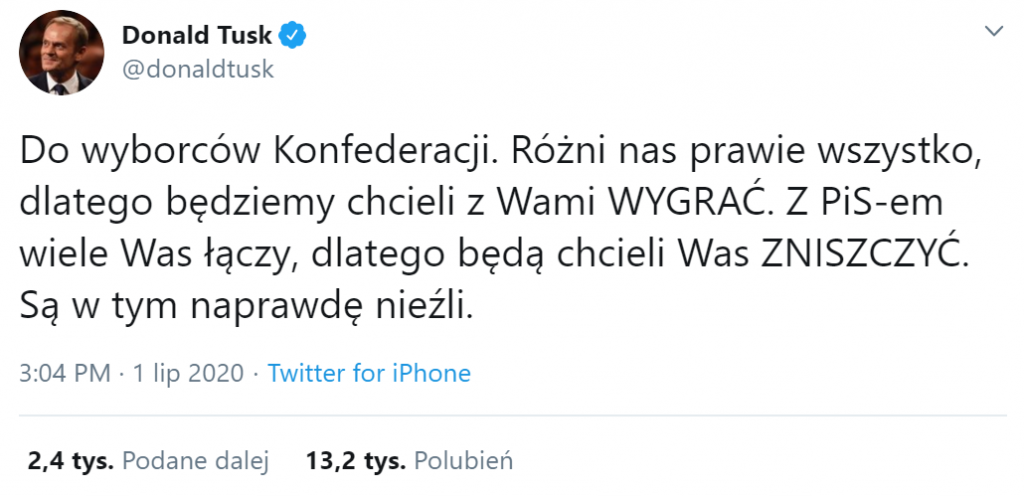 W środę (1.07.2020) Donald Tusk zamieścił na Twitterze wpis skierowany do wyborców Konfederacji. Oczywistym celem tego wpisu jest nakłonienie ich do poparcia Rafała Trzaskowskiego w II turze wyborów prezydenckich 12 lipca.
