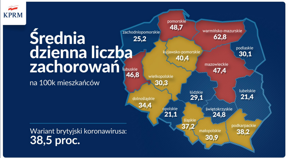 Tym samym do 28 marca twardy lockdown obowiązuje w czterech województwach, ponieważ restrykcje wprowadzono już w warmińsko-mazurskim, a za dwa dni mają zacząć obowiązywać w pomorskim. Następne w kolejce do zamknięcia są województwa: dolnośląskie, kujawsko-pomorskie, małopolskie, podkarpackie, śląskie i wielkopolskie.
