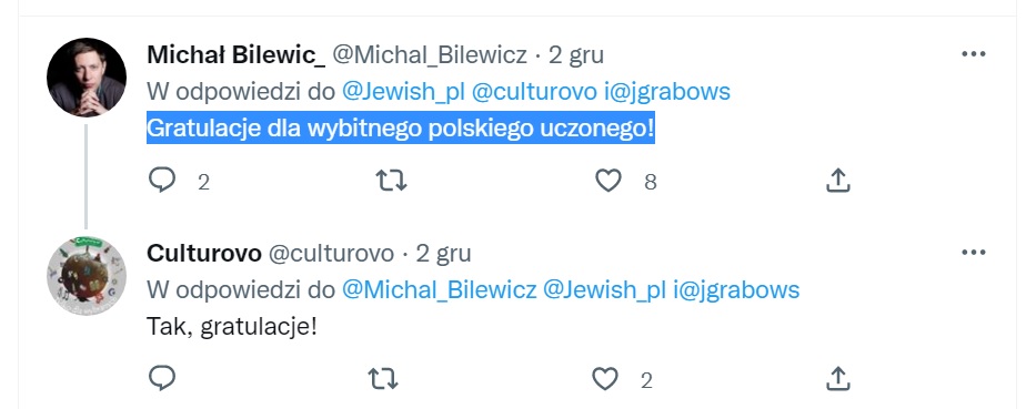 Gratulacje Grabowskiemu złożył „tropiciel antysemityzmu wtórnego”, a zarazem przeciwnik ekshumacji w Jedwabnem, Michał Bilewicz.