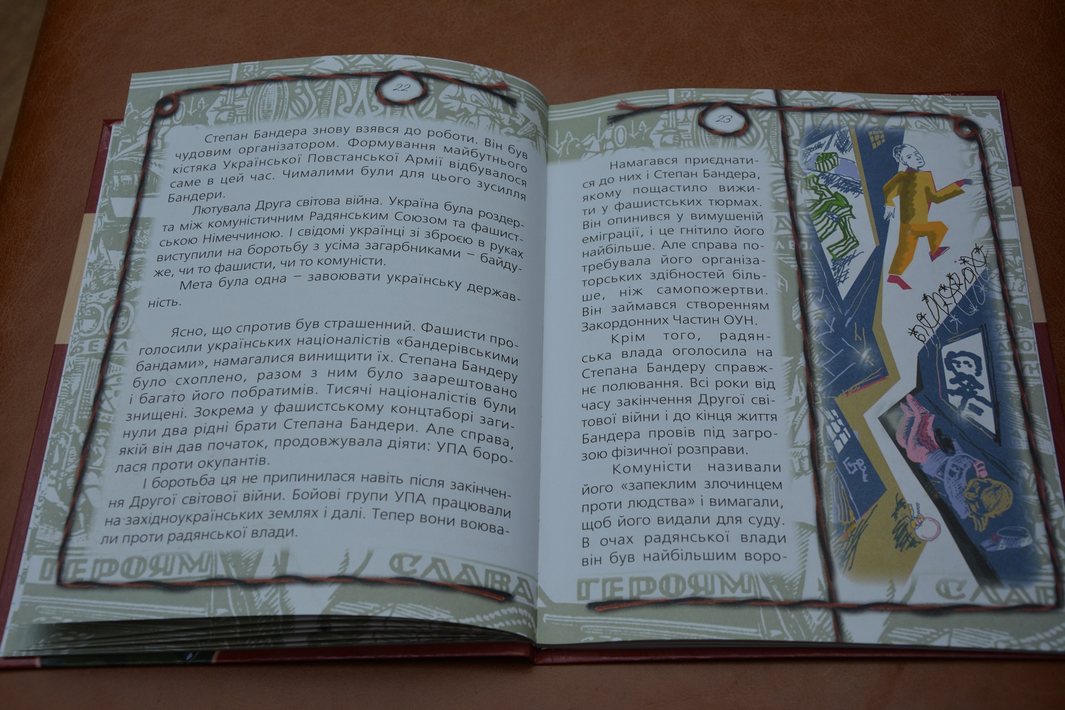 W książce tej zawarte są treści gloryfikujące zbrodnie banderowców, a Stepan Bandera jest prezentowany jako nieskazitelny bohater ukraiński. Już na trzeciej stronie podręcznika przekonuje się, że „banderowcy nie byli faszystami, nie walczyli za Hitlera i nie mordowali niewinnych ludzi”. W książce próbuje się dowieść, że Polacy na wschodzie byli komunistami, a z takimi, jak i z faszystami „bohater” Bandera rozprawiał się bezkompromisowo – „tak jak należy”.