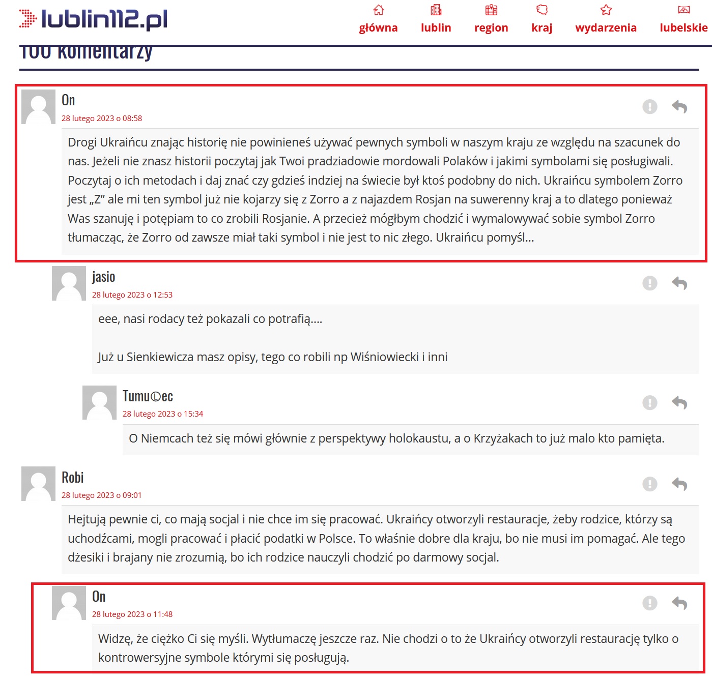 W podobnym tonie sprawę komentują internauci lubelskich serwisów informacyjnych. Na portalu Lublin112.pl jeden z czytelników napisał: Drogi Ukraińcu znając historię nie powinieneś używać pewnych symboli w naszym kraju ze względu na szacunek do nas. Jeżeli nie znasz historii poczytaj jak Twoi pradziadowie mordowali Polaków i jakimi symbolami się posługiwali. Poczytaj o ich metodach i daj znać czy gdzieś indziej na świecie był ktoś podobny do nich. Ukraińcu symbolem Zorro jest „Z” ale mi ten symbol już nie kojarzy się z Zorro a z najazdem Rosjan na suwerenny kraj a to dlatego ponieważ Was szanuję i potępiam to co zrobili Rosjanie. A przecież mógłbym chodzić i wymalowywać sobie symbol Zorro tłumacząc, że Zorro od zawsze miał taki symbol i nie jest to nic złego. Ukraińcu pomyśl…