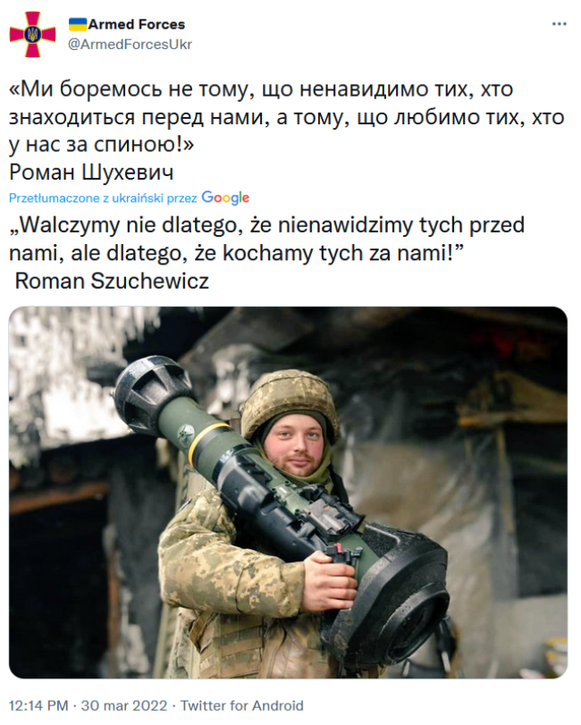 Jak widzicie, wojna nic nie zmieniła. Autorzy i wykonawcy ukraińskiego ludobójstwa na Polakach nadal są bohaterami Ukrainy. Liczenie na to, że w ramach wdzięczności za polską pomoc w wojnie z Rosją Ukraińcy potępią swoich „herojów”, to skrajna naiwność. Polska naraża własne bezpieczeństwo i rujnuje się na pomoc dla ukraińskich uchodźców, a w tym samym czasie ukraińska amia zamieszcza wpis gloryfikujący Romana Szuchewycza, dowódcę UPA odpowiedzialnego za rzeź Polaków.