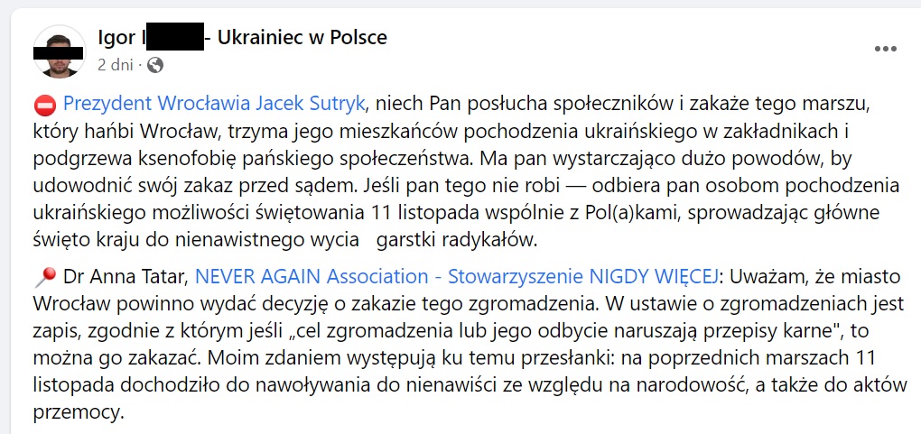 W ostatnich dniach Ukrainiec mocno się zaktywizował i zajadle atakuje Marsz Polaków we Wrocławiu, domagając się jego delegalizacji zanim ten się jeszcze rozpocznie. W swoich wpisach Ukrainiec przywołuje cytowaną przez Wyborczą Annę Tatar. To jego znajoma. Przynajmniej tak wynika z rozmów przeprowadzanych przez I. dla jednego z jutobowych kanałów. Oglądalność tych rozmów jest bliska zeru, co najprawdopodobniej wynika z nikłych walorów estetycznych i merytorycznych pogadanek. Tatar wywodzi się ze stowarzyszenia powszechnie znanego z zaangażowania w cenzurowanie książek, w których o Żydach można przeczytać niekoniecznie pochlebne, wszak zgodne z prawdą stwierdzenia. Wyborczej powiedziała: Uważam, że miasto Wrocław powinno wydać decyzję o zakazie tego zgromadzenia. W ustawie o zgromadzeniach jest zapis, zgodnie z którym jeśli „cel zgromadzenia lub jego odbycie naruszają przepisy karne”, to można go zakazać. Moim zdaniem występują ku temu przesłanki: na poprzednich marszach 11 listopada dochodziło do nawoływania do nienawiści ze względu na narodowość, a także do aktów przemocy.