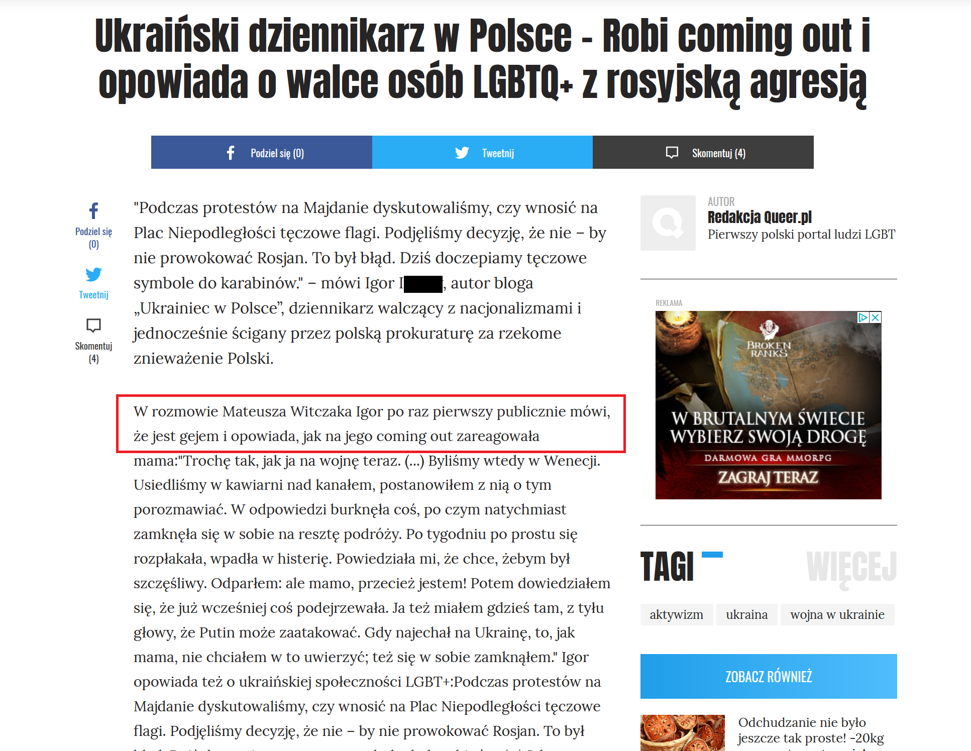 Wśród zajadle atakujących Marsz Polaków jest ukraiński gej, Igor I. (uznajemy, że ów osobnik nie zasługuje na ujawnianie wizerunku i nazwiska). Tak, to ten kaleczący język polski „dziennikarz” z polskim obywatelstwem, który opublikował godło polski na tle ukraińskiej flagi i z koroną w barwach LGBT+. – Mam obywatelstwo polskie. Nie jestem Polakiem. Jestem Ukraińcea, a patrząc na to je suis Ślązak. Takie nasilne wciskanie do polskości – to próba odarcia nas z naszej godności – w styczniu 2022 roku pisał Igor I.