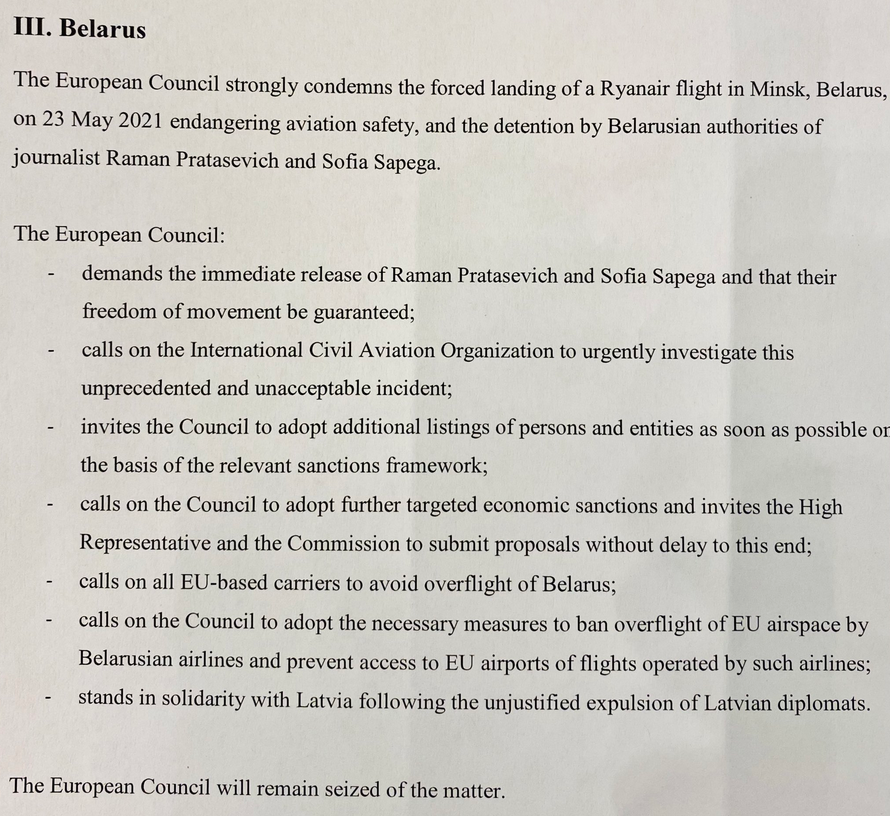 W konkluzjach szczytu znalazł się apel do Organizacji Międzynarodowego Lotnictwa Cywilnego o pilne zbadanie sprawy. Zapowiedziano też stworzenie listy osób, które zostaną objęte sankcjami i wprowadzenie systemowych sankcji gospodarczych. Wezwano też do natychmiastowego uwolnienia Ramana Pratasiewicza i Sofii Sapiegi.