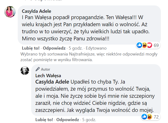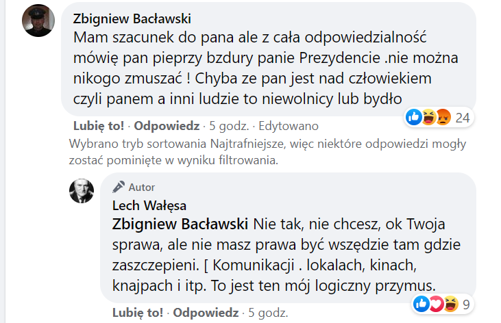 Deklaracja Wałęsy o „prawie przymusowym” szczepieniu wywołała lawinę negatywnych komentarzy. Na niektóre odpowiedział. Okazało się, że były prezydent popiera segregację sanitarną, bo nie chce, żeby zaraził go niezaszczepiony. Fakt, że zaszczepieni również zarażają jeszcze nie przebił się do świadomości Wałęsy.